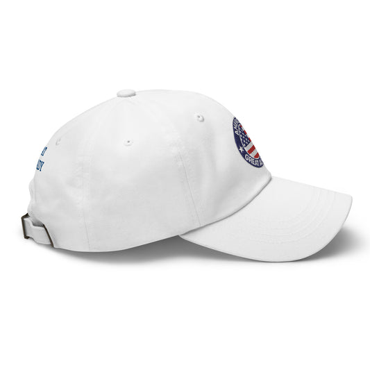 "America's Great Already, Man!" Cap in White with Blue Lettering